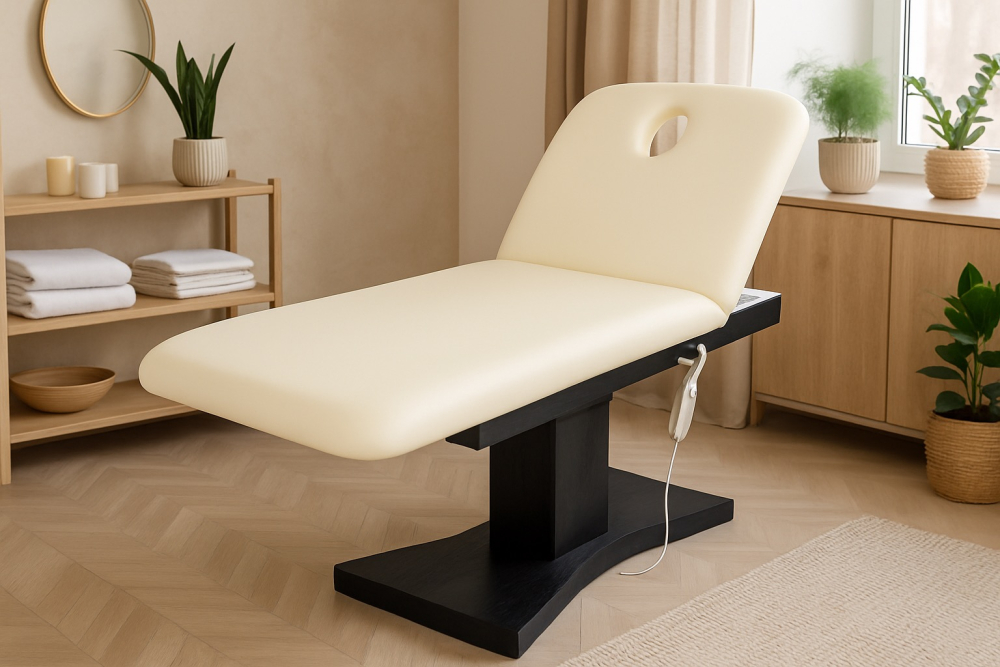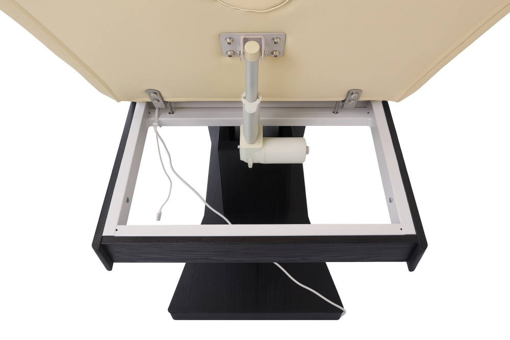 Masážne lehátko je vybavené dvoma elektromotormi. Hlavný elektromotor zdvíha celé lehátko smerom hore a dole. Maximálna výška lehátka je 80 cm a najnižšie sa môže lehátko nastaviť na výšku 62 cm. Menší elektromotor nastavuje uhol prednej polohovatelnej časti od 0° až 50°. Masážný stôl je vybavený dierou na tvár, ktorá sa využíva pri masážach a iných terapiách. K masážnemu stolu je vankúš, ktorý je tvarovaný tak, aby bol vhodný do diery v stole. Príjemnú terapiu zabezpečuje 6 cm hrubý molitan strednej tvrdosti, ktorý je potiahnutý kvalitnou koženkou v jemnej béžovej farbe. Na spodnej časti podstavca stolu sa nachádzajú prostišmykové nožičky, ktoré je možné nastaviť pri nerovnosti podlahy. Nožičky sú skryté pod krytom stolu.