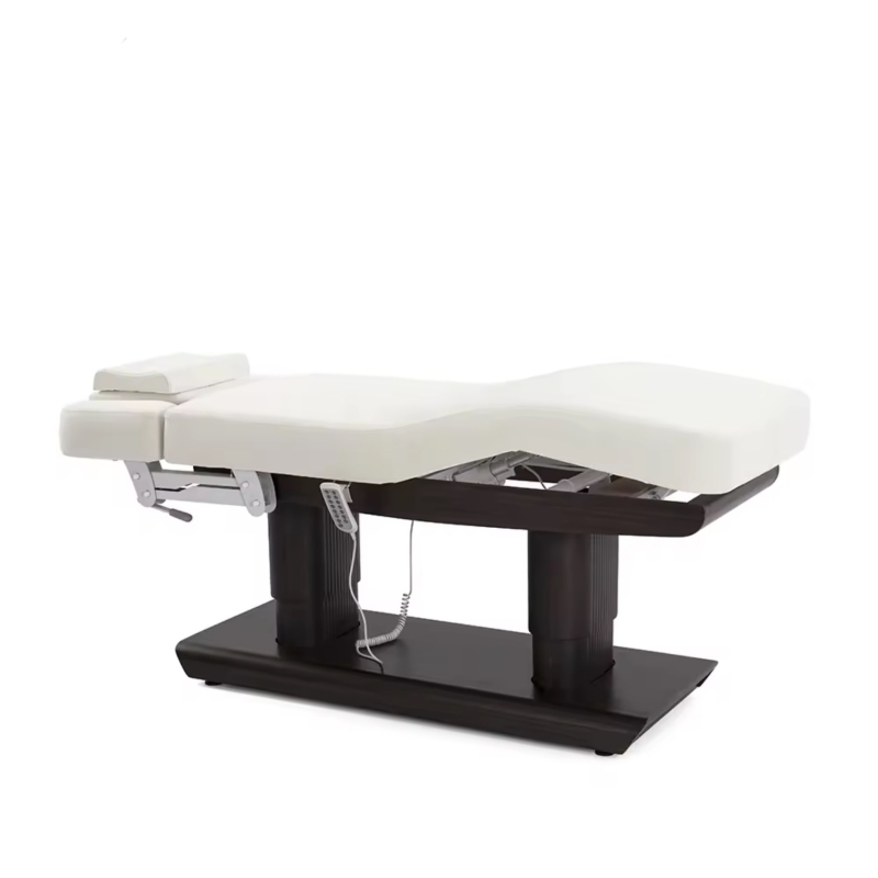 Elektrický stôl Lux je perfektne dizajnovo zvládnutý. Železné časti konštrukcie sú prekryté drevom a imitáciou dreva. Farba dreva je tmavá a koženka je bledá béžová. Masážne lehátko má zabudované LED podsvietenie ukľudňujúcej oranžovej farby, ktoré si viete zapnúť a vypnúť. Masážne lehátko sa ovláda pomocou ručného elektrického ovládania. Lehátko je vybavené zátkou na upchatie otvoru na tvár a vankúšom na podloženie pod hlavu.